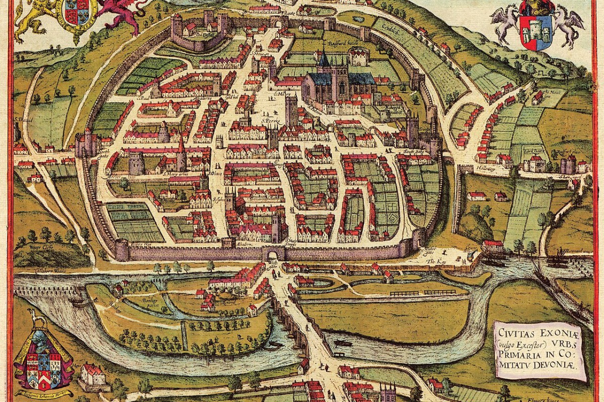 The illustration shows the East Gate of the city, the main street in the middle is Sidwell Street.